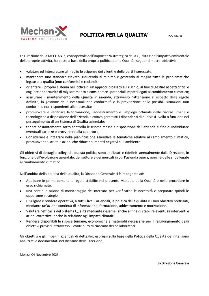 CERTIFICATO n. 1763710305 confermato da stampato da codice di validità D03A332D-AF1. Questo documento certifica che il Sistema di Gestione per la Qualità di MECHAN-X srl, via Aspromonte 15 – 20900 Monza, Italia, è conforme alla norma ISO 9001:2015 per i seguenti settori di attività: lavorazioni meccaniche di precisione per conto terzi.